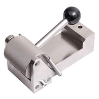 This grip is designed for wire pull testing applications. The grip secures wire terminals, cables, connectors, and other samples for wire pull tests. Grooves of multiple sizes are provided to accommodate a wide range of wire diameters up to 0.25 in. (6.3 mm). Simply rotate the turret wheel to the desired size. Integrated magnets hold the wheel in place to help prevent accidental rotation to a different sized groove. For unique sample shapes and sizes, a blank machinable terminal fixture is also available.