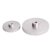 They are available in aluminum or steel. Aluminum for testing soft samples such as cardboard, plastics, rubber, foams, lightweight springs, bottles and cartons. Steel for testing rubber, plastics, heavy duty springs, building products, composites and ceramics.
