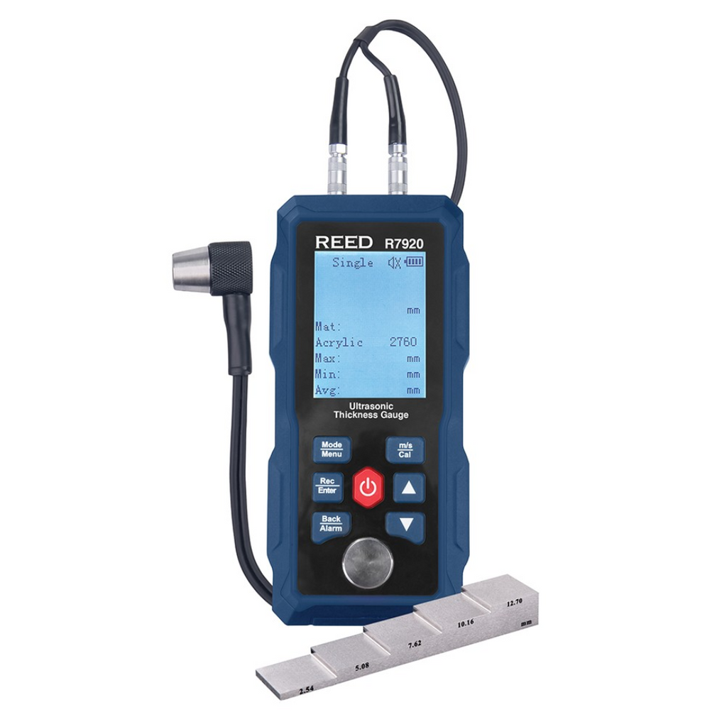 The Reed R7920 delivers precision thickness measurement through ultrasonic technology, employing sound wave propagation to assess material dimensions without surface damage. This portable instrument excels in industrial settings where rapid, accurate readings are essential—ideal for quality control, maintenance, and inspection workflows across manufacturing, aerospace, and construction sectors. Configurable alarm thresholds alert users to out-of-spec conditions in real time, while the integrated 300-measurement data logger streamlines documentation and trend analysis. An intuitive control layout minimizes training overhead, enabling technicians to achieve consistent results across diverse metallic and composite substrates.